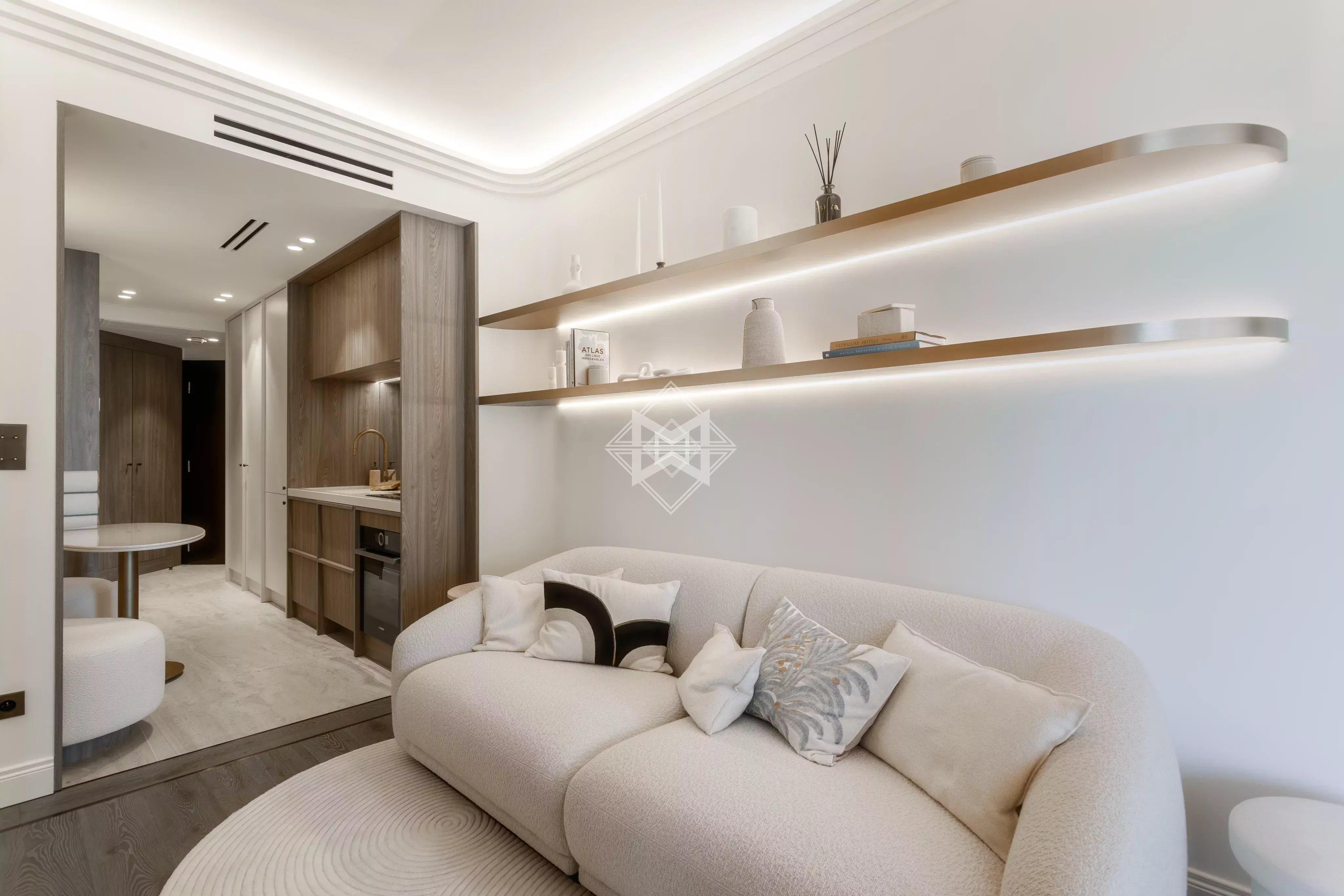 L'espace de vie s’articule autour d’une entrée élégante, d’un salon avec coin nuit intégré, d’une cuisine entièrement équipée avec espace repas, et d’une salle de douche avec WC séparé.