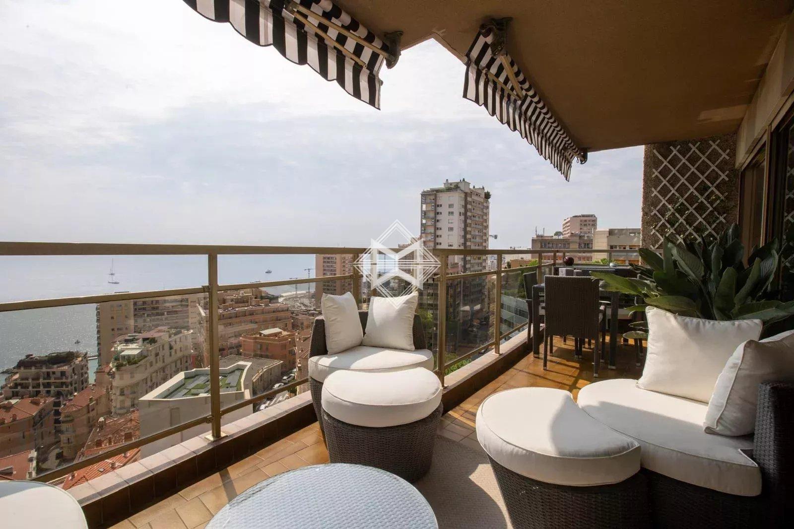 Dans un bel immeuble surplombant la principauté, grand trois pièces entièrement rénové offrant une magnifique vue de la mer et de la ville. Il se compose d'une entrée avec toilettes invités, d'une grande chambre aujourd'hui transformée en dressing et d'une salle de douches, une cuisine indépendante, un large salon - salle à manger, et d'une chambre de maîtres avec salle de bains en suite.