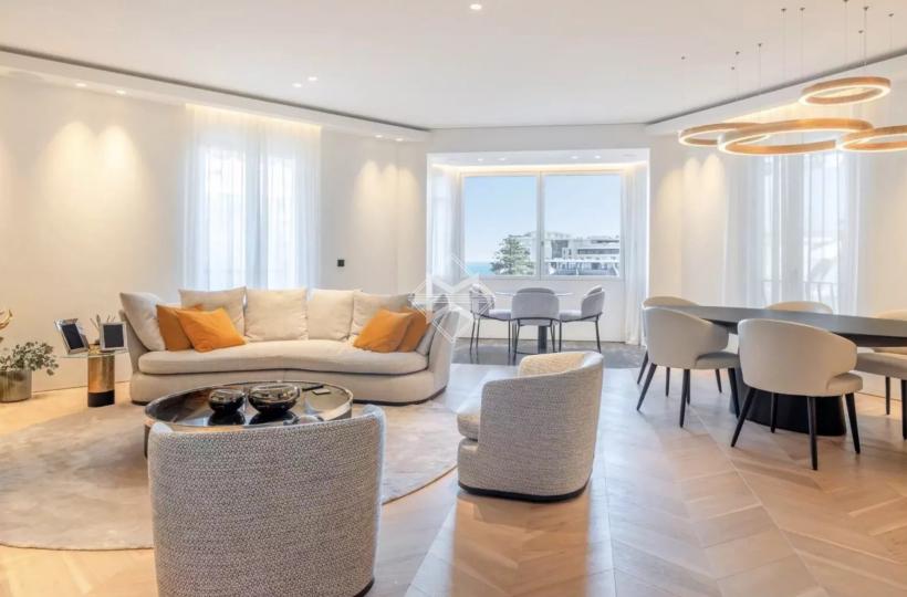 Le vaste séjour, baigné de lumière naturelle, se distingue par ses volumes généreux. Il s’ouvre sur un balcon bénéficiant d’une vue dégagée, permettant de profiter pleinement de l’environnement urbain prestigieux de Monte-Carlo.