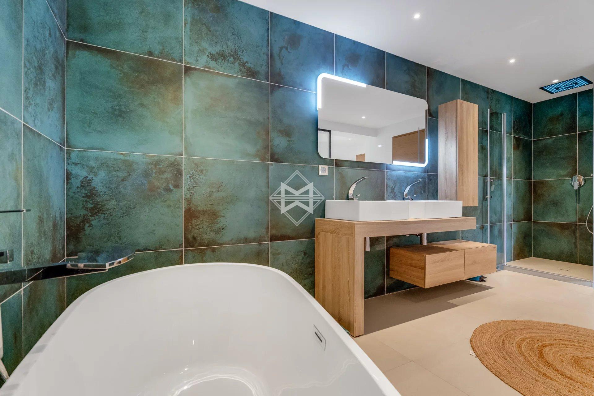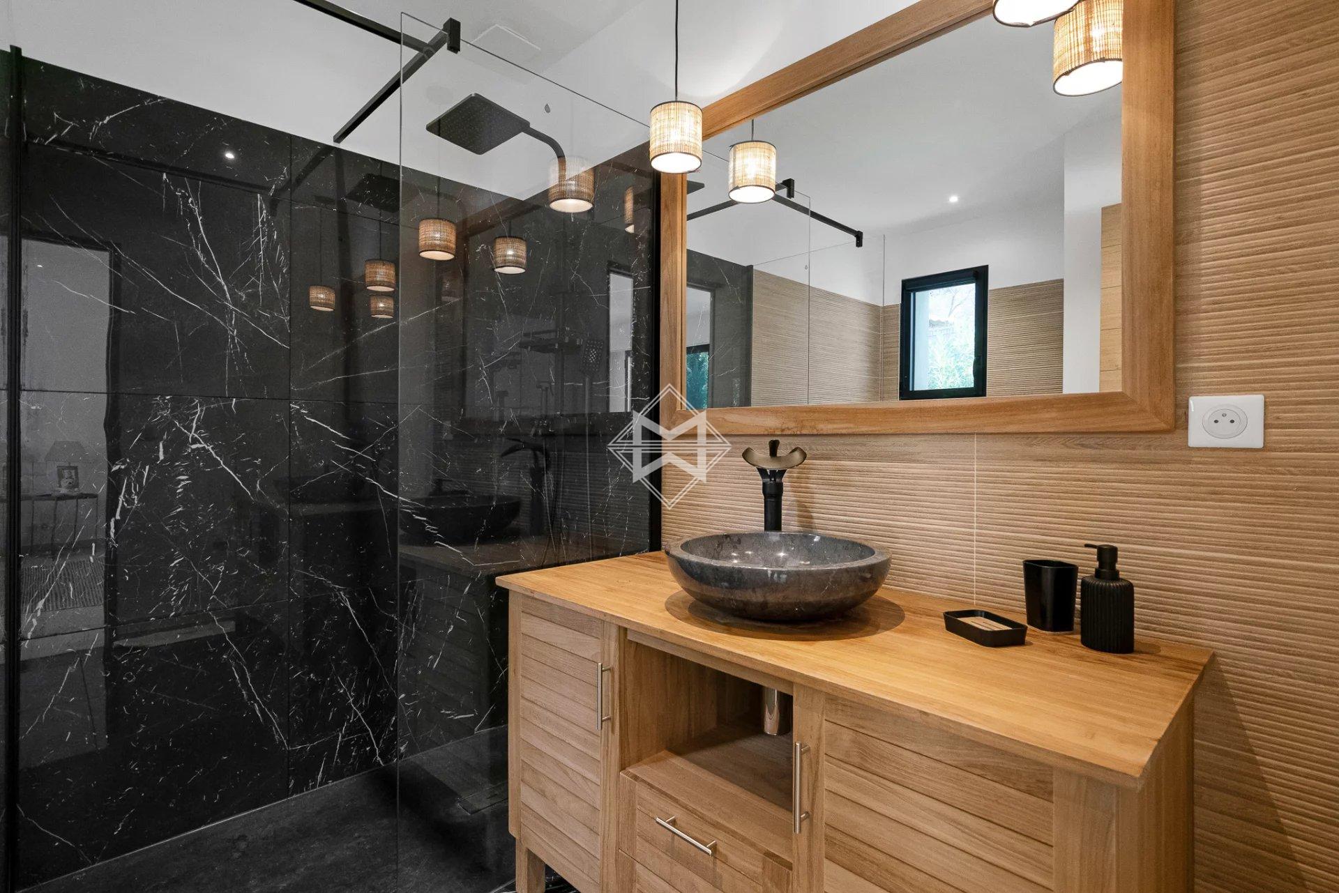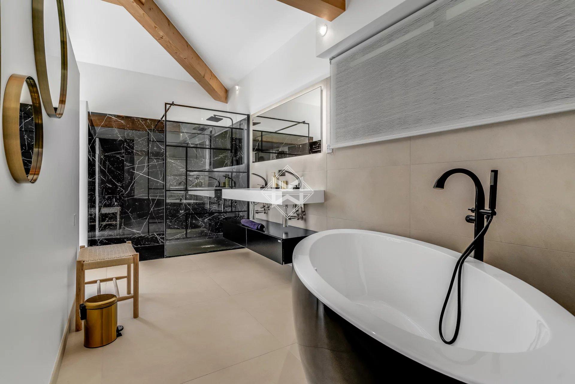 Cette réalisation haut de gamme dispose d'une surface habitable d'environ 350m2 répartis comme suit: au rez-de-chaussée un grand et lumineux séjour cathédral et sa cuisine américaine s'ouvrant sur le jardin, 3 suites dont 1 grande et magnifique master bedroom.