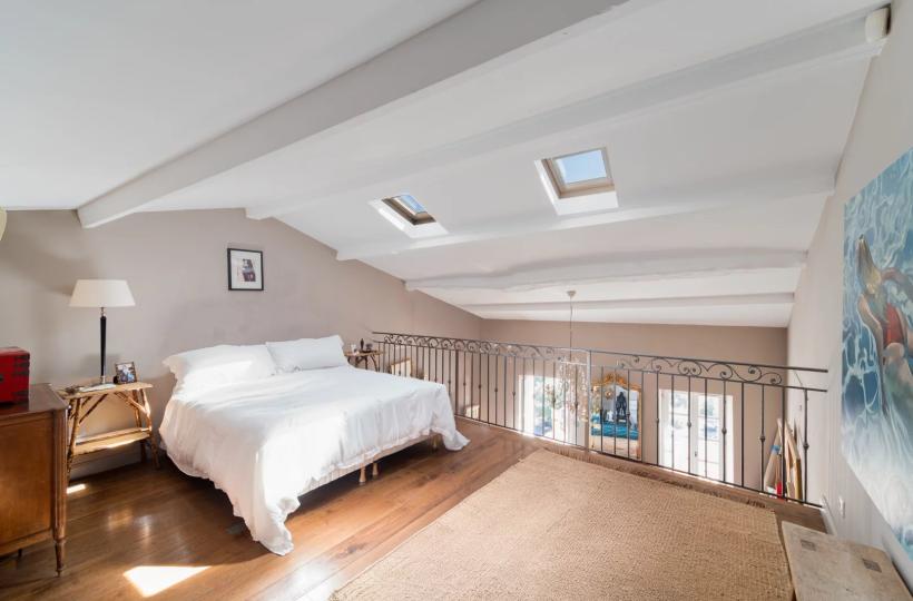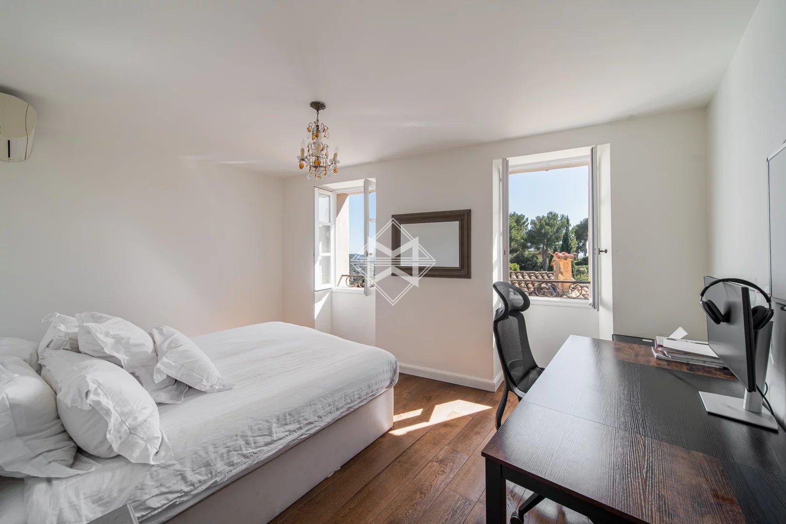 Les étages supérieurs proposent deux chambres, dont une belle suite avec salle de bains, ainsi qu’un espace bureau ou mezzanine, offrant une vue dégagée jusqu’à la mer.